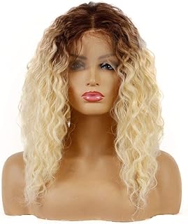 vvbing 20% Human Hair+80% Synthetic Fiber Lace Front Wig 13x3.5Inch Ombre Blonde Brown Roots Short Loose Curly Synthetic Wig Half Hand Tied Wigs Natural Hairline Heat Resistant Fibers For Women 14Inch