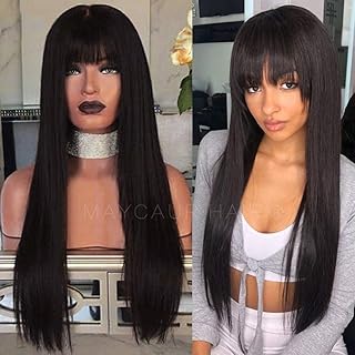 Maycaur Black Synthetic Hair Wigs with Full Bangs Long Straight Women's Wig Heat Resistant Synthetic No Lace Wigs for Women