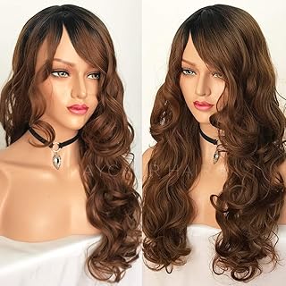 Maycaur Natural Looking Ombre Color None Lace Wigs Synthetic Heat Resistant Hair Wig with Side Bangs Long Wavy Glueless Synthetic Wigs For Women Daily (Ombre Brown)